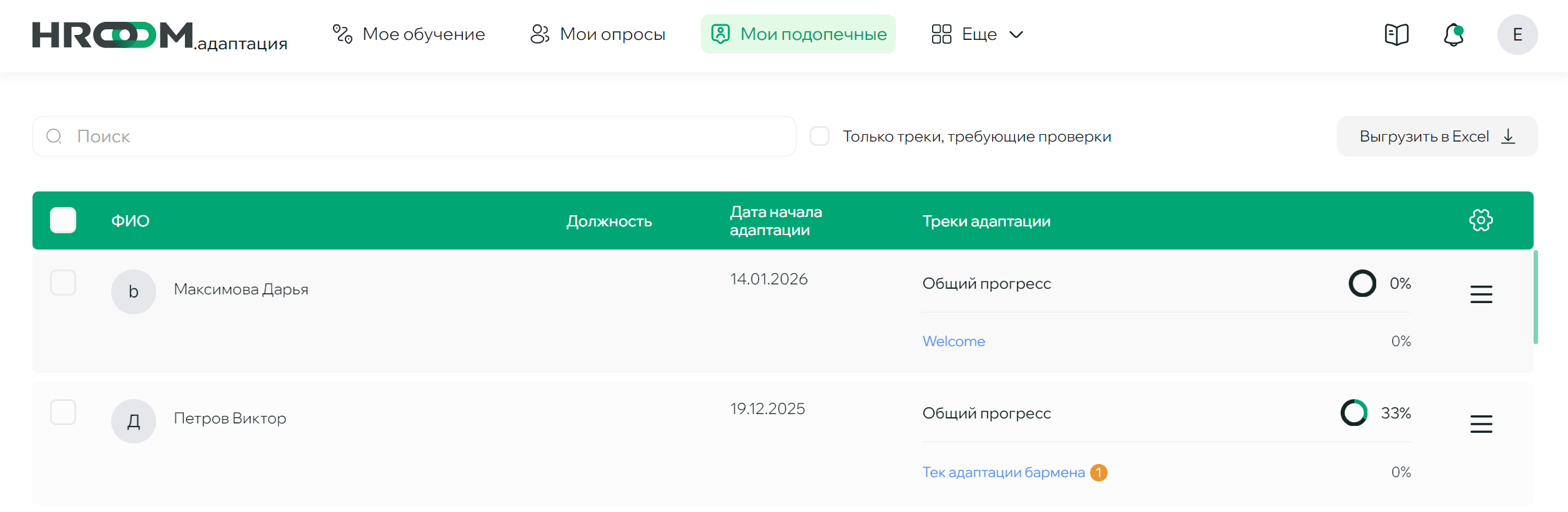 В разделе "Мои подопечные" отображаются все сотрудники, которым назначен трек адаптации: