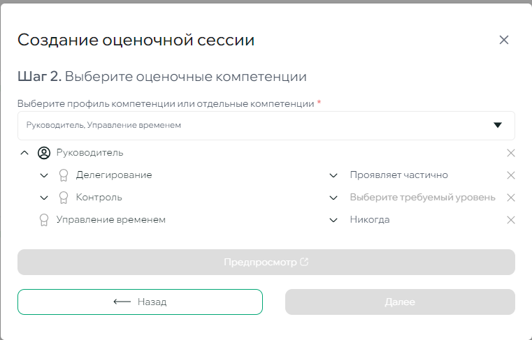 На втором шаге вы выбираете компетенции, которые будут оцениваться в рамках сессии. Можно выбрать профиль и часть компетенций из него, так и отдельные компетенции, для каждой компетенции можно выбрать список индикаторов, которые будут использоваться при оценке.