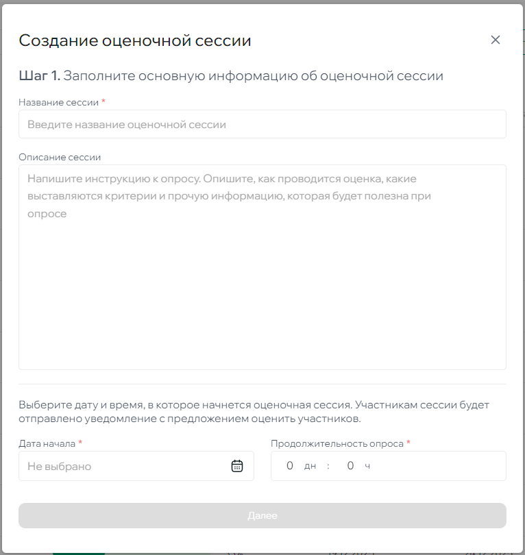 Процесс создания оценочной сессии состоит из нескольких шагов.